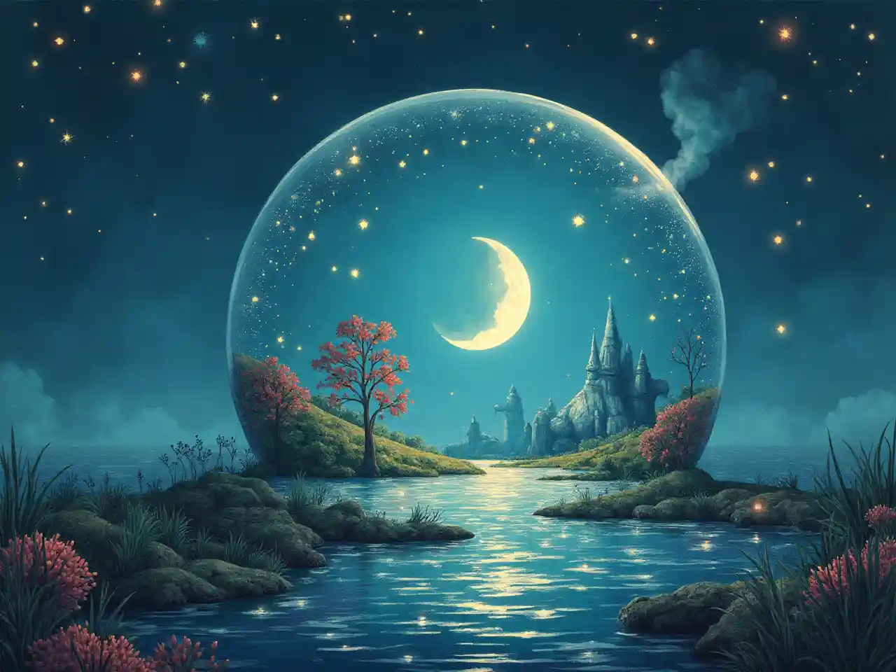 Arte abisal inspirado en Tim Burton y Shaun Tan Visualiza un ((mundo surrealista de maravillas)) donde la escena está encerrada dentro de una (estructura de vidrio similar a una burbuja), con el paisaje bañado en un brillo suave y brumoso. El cielo está adornado con una serie de estrellas, brillando como diamantes, cada una emitiendo una luz tenue y centelleante. El primer plano se destaca con una (corriente de agua débilmente brillante), que refleja los colores del medio ambiente. La superficie del agua ondula con una gracia suave, mejorando la calidad reflectante de la estructura de vidrio. El ambiente general es de una belleza etérea. Una (luna creciente brillante) agrega un toque de iluminación a la escena. El vapor emite una (niebla brillante) que crea un efecto de ensueño, que se mezcla a la perfección con el entorno. Una figura tenue y sombría agrega profundidad a la escena, destacando el contraste entre el brillante y colorido primer plano y el (cielo fantástico y suavemente iluminado).