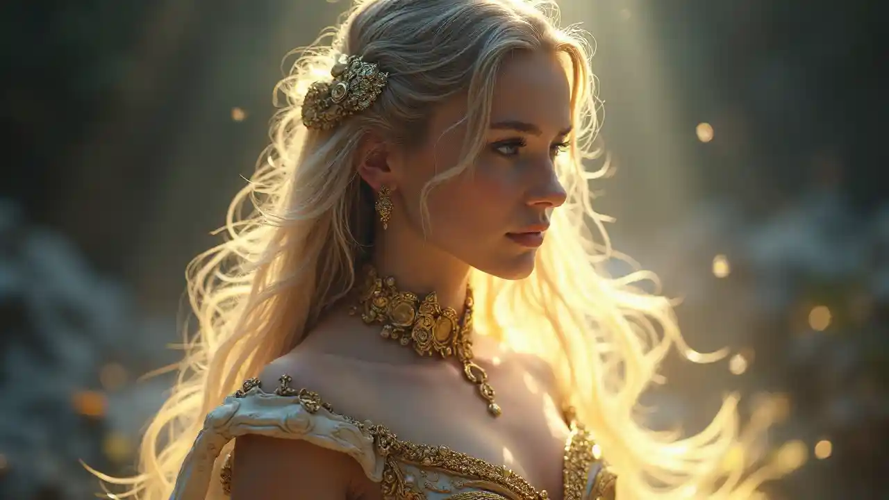 El resplandor etéreo de una guerrera radiante en un mundo místico