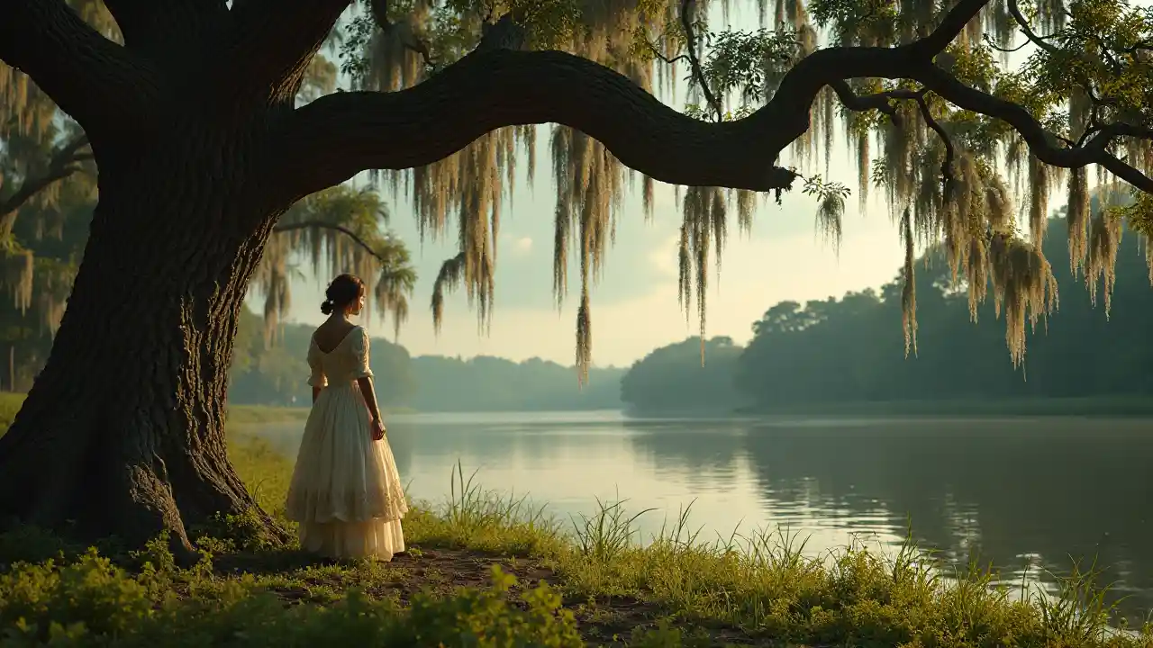 BrooklynFrancés del siglo XVIII, Evangeline de pie bajo un roble musgo español mirando el Bayou esperando a su amor perdido para siempre Gabriel