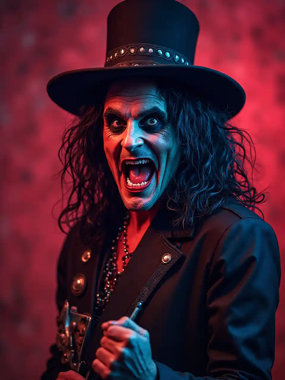 ChloeSteve Tyler de Aerosmith como un personaje malvado que usa un disfraz espeluznante de Halloween, colores saturados vívidos, color de contraste