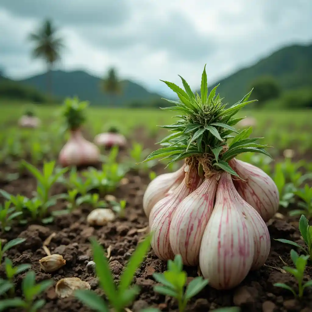 plantas de ajo con bulbos de cannabis encima en un campo de cebollas en una isla tropical