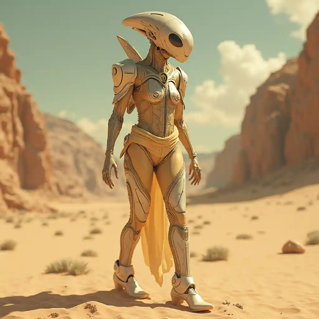 Entidad alienígena en el desierto Solarpunk: elegancia futurista y encanto