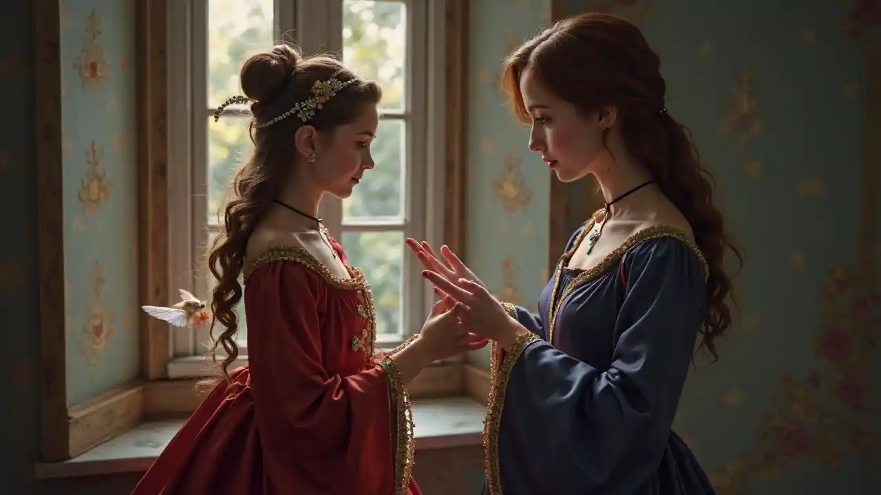 una joven (cabello castaño oscuro) con un vestido medieval de raso rojo-azul está de pie frente a una ventana. tocando sus palmas. Una pequeña hada voladora está hablando con ella informando de una situación.