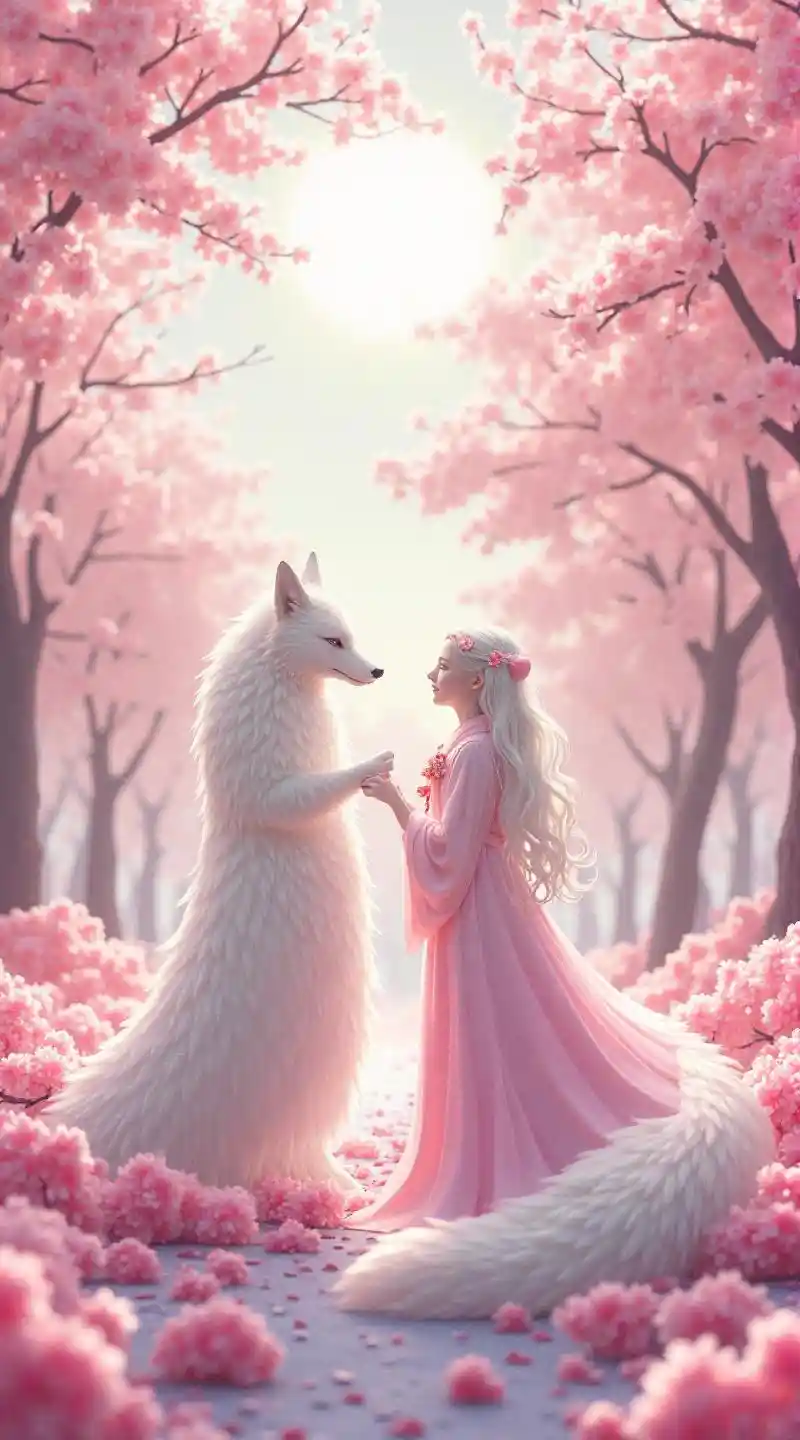 (((Foto de dos tomas del zorro blanco y la diosa de los cerezos en flor: 1.5))), Un fantástico paisaje de cerezos en flor, Un mundo rosa claro en general, una niña muy linda dios