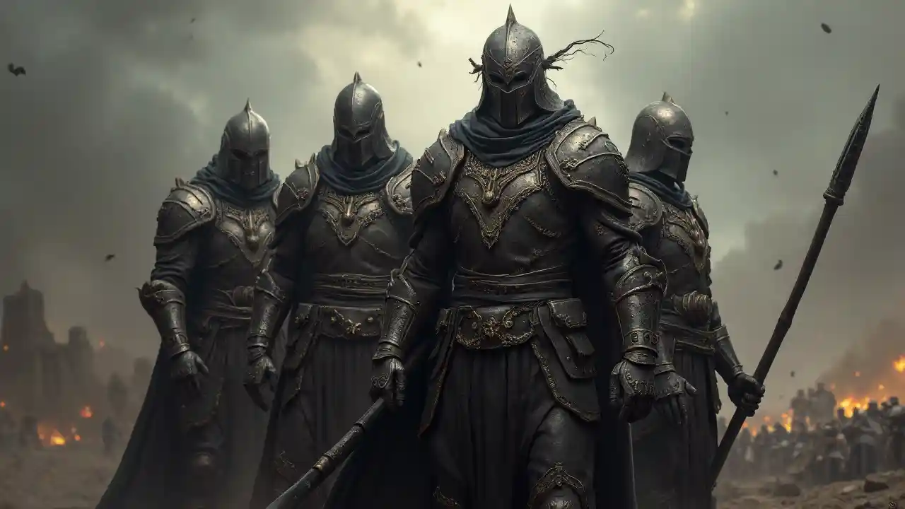 Armadura y arma intrincadas, paleta de tonos oscuros, campo de batalla en el fondo; cuatro figuras en poses militantes; orientación de retrato; exudando poder, intensidad y profundidad emocional; composición épica con elementos tribales de fantasía oscura, sombras dramáticas y tensión atmosférica; ligeros matices creativos que mejoran el concepto central.
