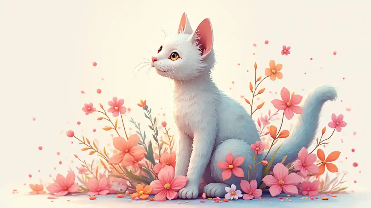 Una ilustración detallada de una impresión de un gato colorido, flores de fantasía, diseño de camiseta vintage, al estilo de Studio Ghibli, colores tetradic pastel blanco claro y rosa, arte vectorial 3D, lindo y peculiar, arte de fantasía, efecto de acuarela, bokeh, Adobe Illustrator, dibujado a mano, pintura digital, low-poly, iluminación suave, vista de pájaro, estilo isométrico, estética retro, centrado en el personaje, resolución, representación fotorrealista, uso de 4K Cin4D