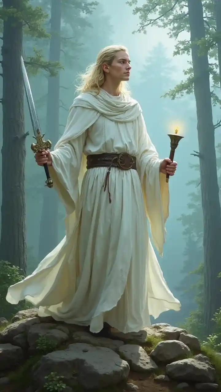 Es una pintura de fantasía de un mago elfo rubio, bien afeitado, empuñando una hermosa espada de hoja de luna en una mano y un tomo de hechizos en la otra, vestido todo de blanco y de pie en un bosque brumoso en la cima de una colina.