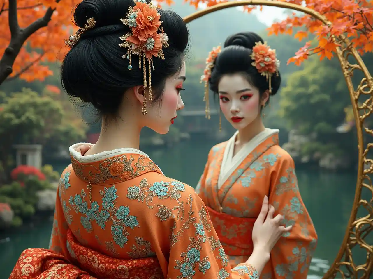 Hermosa Geisha con un vestido de encaje de motivos intrincados de color naranja lila turquesa y dorado que toca un reflejo reflejado de sí misma, fondo de jardín de palacio japonés de otoño, cabello oscuro, fantasía oscura, detalles intrincados, hiperdetallado, Jean Baptiste Monge, Carne Griffiths, Michael Garmash, seb McKinnon, obra maestra