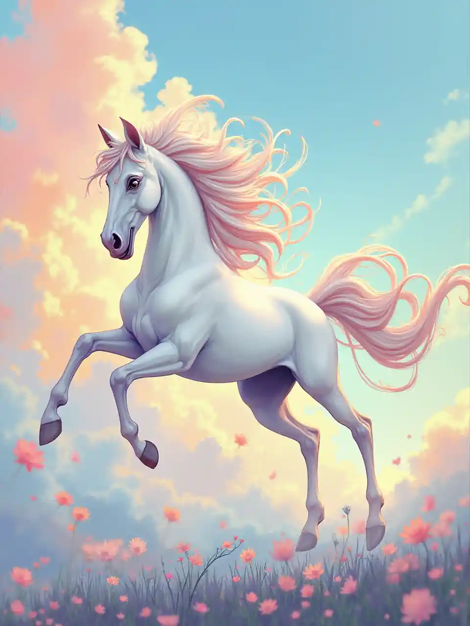 caballo de estilo anime, corriendo por el aire, larga melena que fluye, cola extendida, combinación de colores pastel, atmósfera de ensueño y caprichosa, inspirada en Boleslaw Cybis, pintura con tinta europea moderna, pintura con aerógrafo, degradados suaves, telón de fondo hermoso y sereno, calidad etérea, alto detalle, colores vibrantes pero delicados, ambiente místico, composición visual encantadora, elementos de fantasía