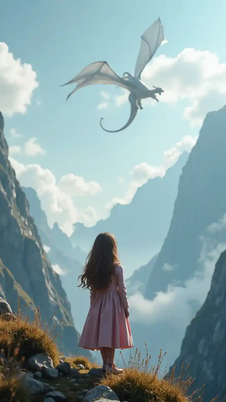 Avaniña pequeña mirando hacia el ángulo de la cámara de visión trasera de la montaña, a una distancia muy lejana un dragón blanco amistoso volando en el cielo blanco nublado, fantasía, realista