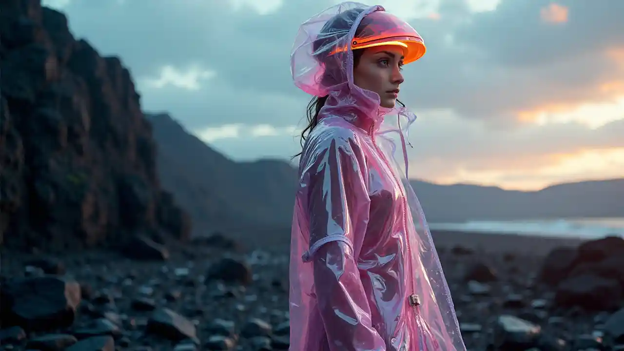 una fotografía de cuerpo entero de un estudio profesional de retratos de alta moda de ultra alta definición de una modelo femenina que viste un impermeable perlado transparente y una visera de neón en un entorno de roca negra islandesa al amanecer. sin artéculos. extremadamente detallado. crudo. refraccione. poca profundidad de campo. luz volumétrica y sombra. trazado de rayos. rayos de luz