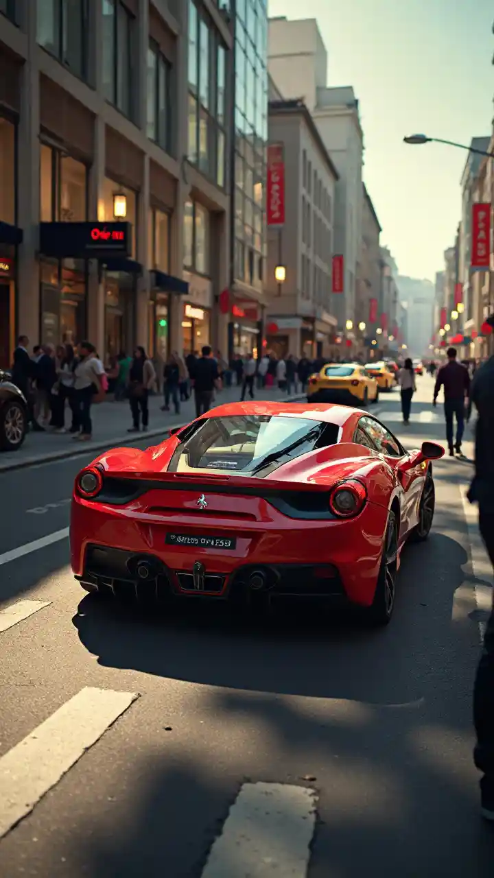Ferrari 488 GTB:: Luz intensa y direccional que proyecta largas sombras:: Fondo energético bullicioso con la vida de la ciudad:: Coche colocado prominentemente en el medio de la composición:: Vibrante calle urbana llena de transeúntes y tráfico:: Imagen reflejada del automóvil en una fachada de edificio de vidrio:: Primer plano detallado del alerón trasero y las luces traseras del automóvil:: Peatones posicionados alrededor del automóvil para enfatizar su diseño elegante:: Se agregó filtro sepia para un clásico, sensación urbana:: Perspectiva de ángulo ligeramente alto que captura el entorno dinámico de la calle:: Objetivo principal para mejorar la claridad de la imagen con una profundidad de campo pronunciada:: ultra detallado y fotorrealista --ar 3:2 --s 50