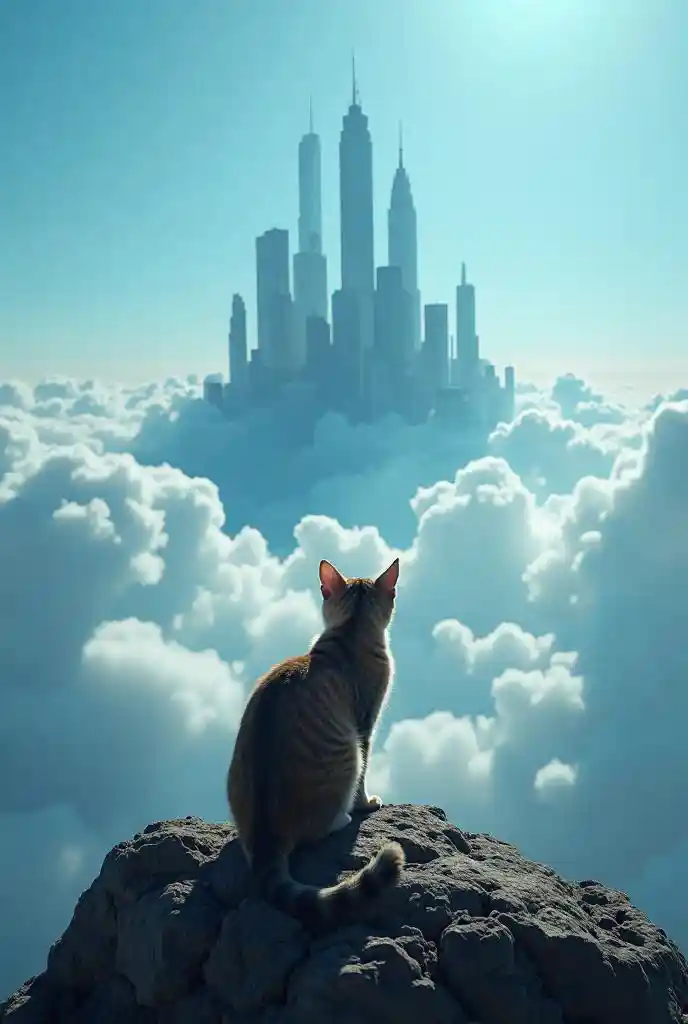 ultra realista, fotorrealista, foto documental, escena dramática, sombra, ciudad azul flotante sobre las nubes gol, gato\ (gato atigrado, lindo, ultra realista, pho