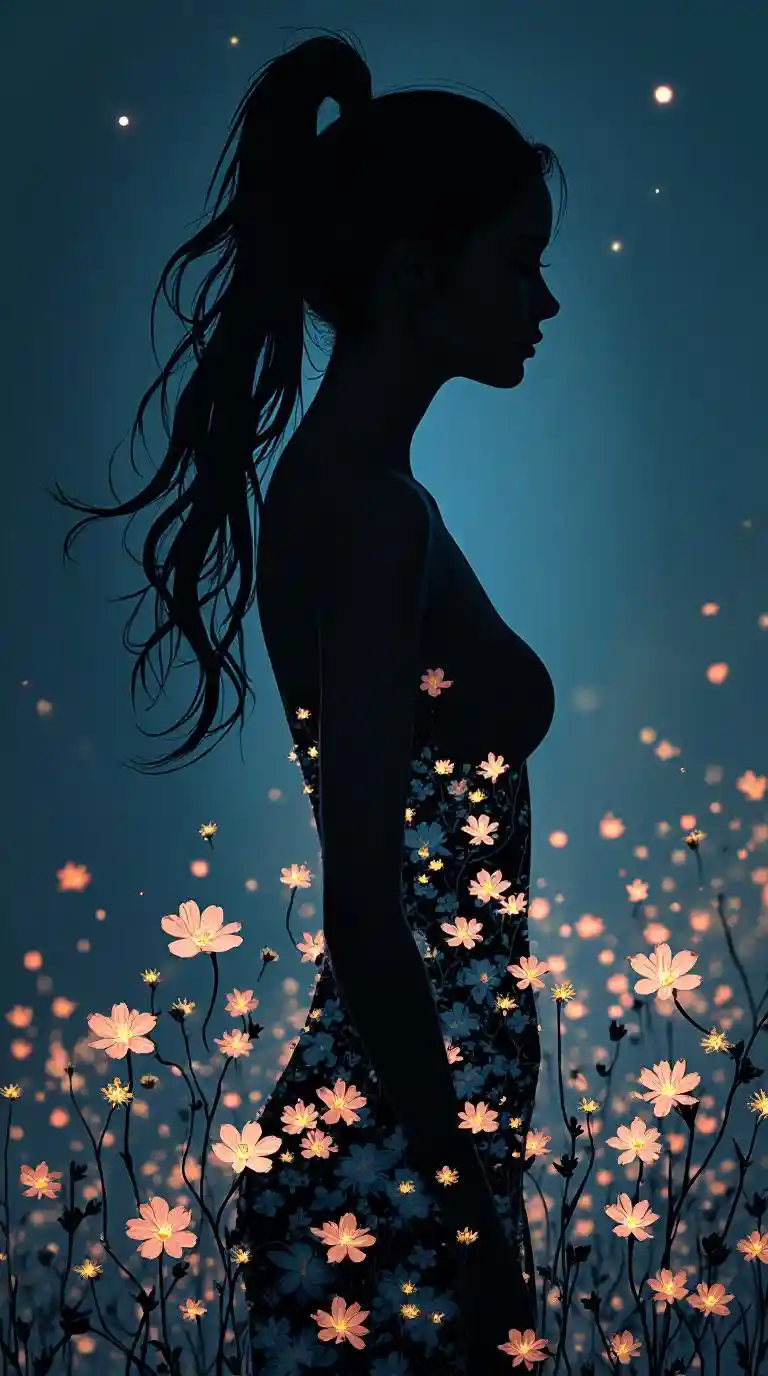 Efectos de iluminación abstractos, Estilo de medio viaje, Fotorrealismo, Cinematográfico, Alta fidelidad, Realismo, Juego ligero, Silueta del cuerpo de una mujer, contornos definidos por una variedad de delicadas flores, telón de fondo nocturno con toques de luz estelar, sombras bailan alrededor de los bordes de las flores, creando un contraste suave pero poderoso, flores en tonos monocromáticos con sutiles degradados de color, estilo de lavado de tinta, detalle ultra fino, iluminación dramática. estilo Makoto Shinkai, Jamie Wyeth, James Gillard, Edward Hopper, Greg Rutkowski Studio Ghibli Genshin Impact, Studio Ghibli Genshin Impact
