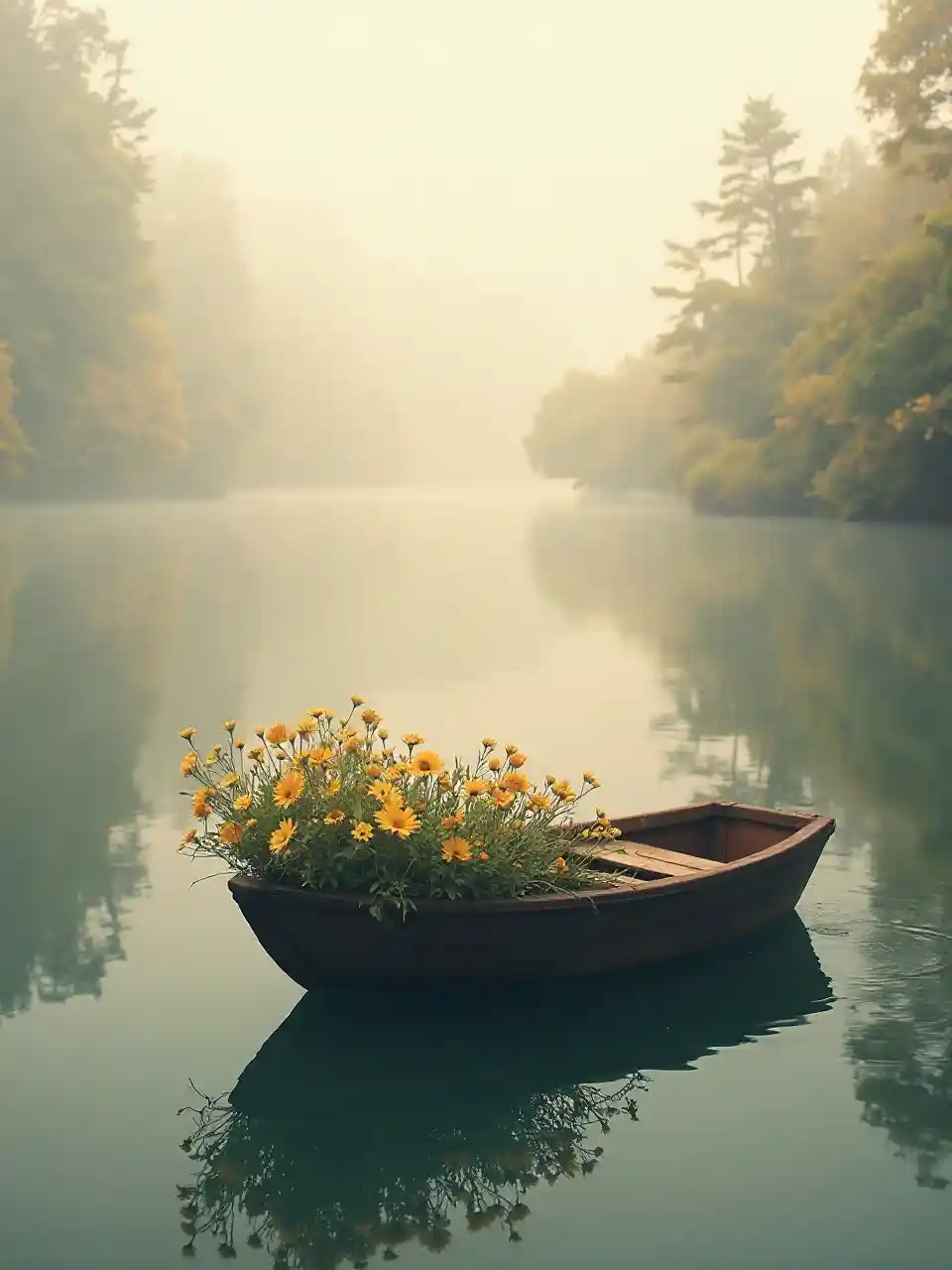 LukeAñadir barco con flores sereno, tranquilo, natural, reflexivo, pintoresco, tonos cálidos, luz suave, paisaje, pacífico, armonioso, tranquilo, escénico, etéreo, atmosférico, minimalista