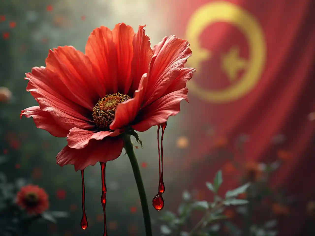 EmeryUna flor que desgarra la sangre con el terremoto en el fondo y la bandera de Marruecos