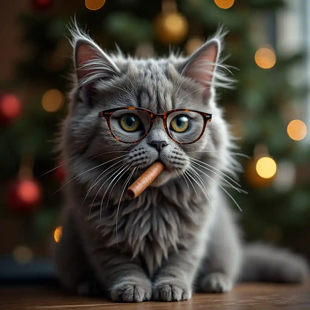 lindo gato, gato gris, cigarro para fumar, anteojos sin montura, esponjoso, hermoso, árbol de Navidad, estilo caballero, calidad de la foto