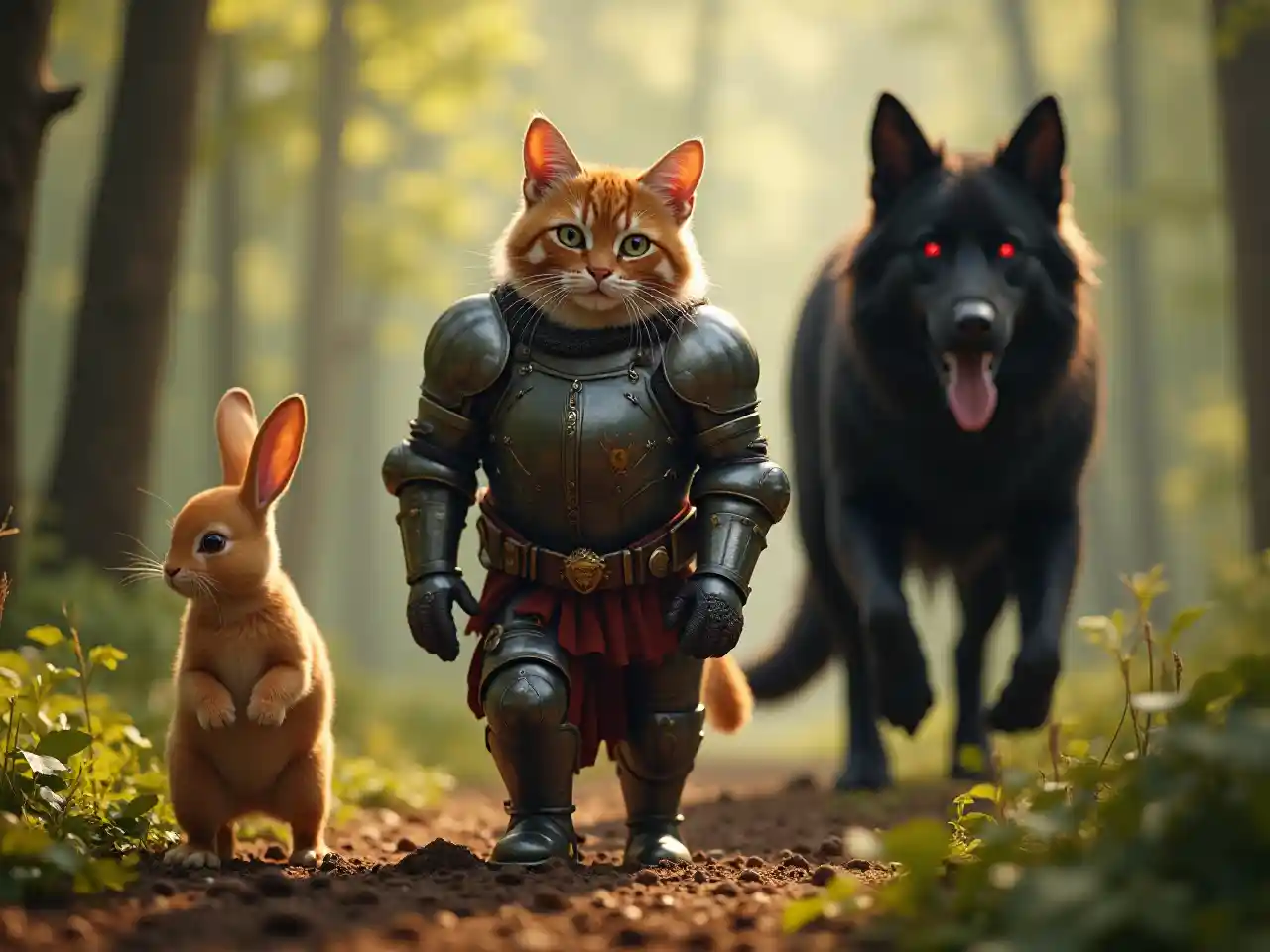 Una majestuosa y realista escena del bosque que muestra a un gato grande y elegante que llega dramáticamente. El gato tiene una postura orgullosa y noble, vistiendo un traje detallado de brillante armadura metálica como un caballero. Sus ojos son agudos y determinados, y su cola se balancea con confianza. El gato se encuentra entre el conejo anaranjado y esponjoso y el gran perro negro con ojos rojos, irradiando autoridad. El bosque está iluminado por rayos de luz solar dispersos, y el fondo se difumina suavemente utilizando la profundidad de campo cinematográfica.