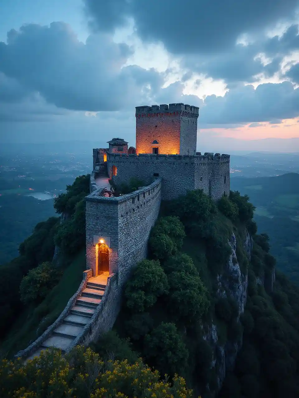 Star Fort Nossa Senhora da Graça, (La Lippe), majestuosa fortaleza en la colina de Gracia, vista panorámica, rodeada de exuberante vegetación, arquitectura histórica, fuertes muros defensivos, colores vibrantes, cantería detallada, cielo crepuscular con nubes dramáticas, atmósfera encantadora, ambiente pacífico pero poderoso, capturando una rica historia, alta calidad, iluminación cinematográfica ultra detallada.