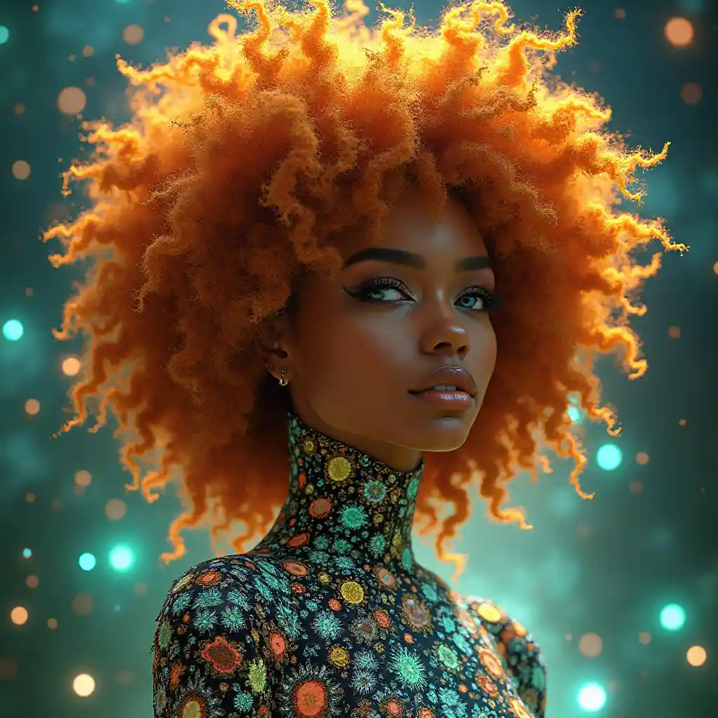 Un retrato hiperrealista y surrealista de una mujer afroamericana con un afro naranja de estilo natural, que encarna una estética mod de los años 60 y 70. Su forma está elaborada a partir de conjuntos de Mandelbrot y Julia, triángulos de Sierpinski, que se fusionan a la perfección en brillantes copos de nieve de Koch y estructuras fractales recursivas en forma de árbol. Su cabello largo, salvaje y rizado de color naranja fluye hacia afuera en zarcillos fractales, brillando con tonos neón pastel que se mezclan con los patrones infinitos y alucinantes que la rodean. Sus penetrantes ojos azules irradian un resplandor interior, anclando el caos que se arremolina a su alrededor. Lleva intrincados patrones de ilusión óptica en blanco y negro que crean un efecto hipnótico e hipnótico. Entrelazados en la escena hay holofractales holográficos de Mandelbrot en tonos de verde, verde azulado y oro amarillento, arremolinándose y brillando como hologramas cósmicos, rompiendo y complementando las ilusiones en blanco y negro con un ambiente elegante y futurista. Estos fractales pulsan con luz iridiscente, agregando profundidad y un borde de ciencia ficción a la composición. La escena está bañada en una luz suave y radiante que acentúa las texturas cristalinas de vidrio líquido de su cuerpo fractal, refractando arcoíris iridiscentes a través de la composición. Detrás de ella, una expansión cósmica se despliega con brillantes gradientes de colores pastel y reflexiones infinitas, evocando un reino de ensueño y psicodélico. El estilo fusiona el hiperrealismo con el arte fractal, con detalles nítidos e intrincados y una atmósfera luminosa y divina. La paleta de colores estalla con vívidos pasteles, blancos brillantes y verdes y verdes holográficos, creando una profundidad infinita de otro mundo llena de belleza y mística.