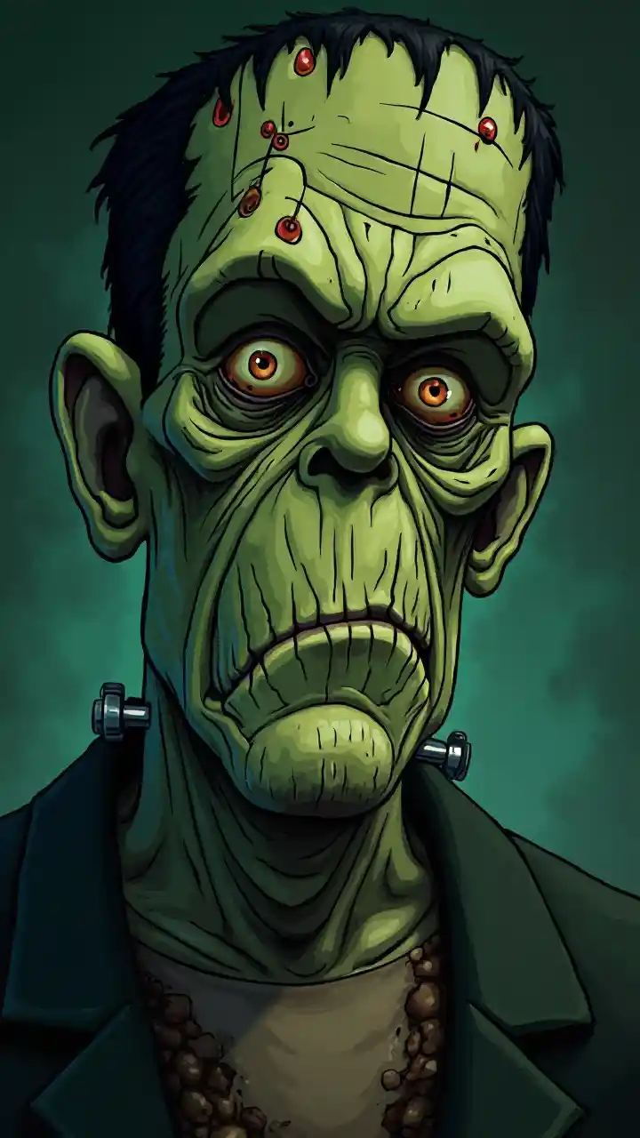 Imagen de dibujos animados hiperrealista de Boris Karloff como el monstruo de Frankenstein, piel verde, paleta de colores apagada, atmosférica, espeluznante, detalle intrincado, cadáver reanimado, tejido cicatricial, descomposición, ojos estelares, horror, horror, cuello, pernos, gangrena, venas, mutilados, puntos en cara