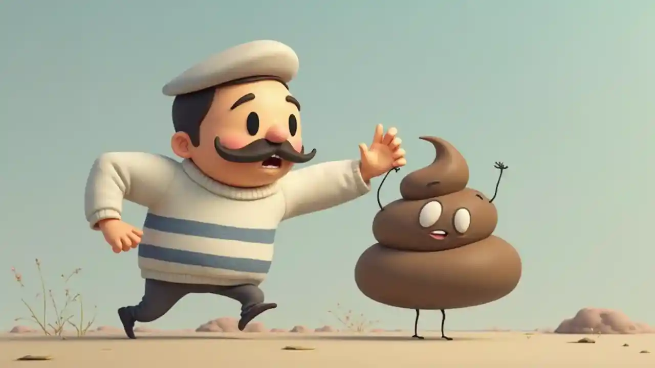 Hombre francés con bigote y boina usando un suéter blanco con rayas horizontales azules siendo perseguido por un gran emoji de caca
