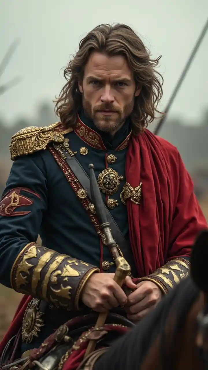 NoahHacer un oficial francés en la guerra de Napoleón Usar doblez de cabeza ensangrentada y sostener un sable mientras se une a un caballo