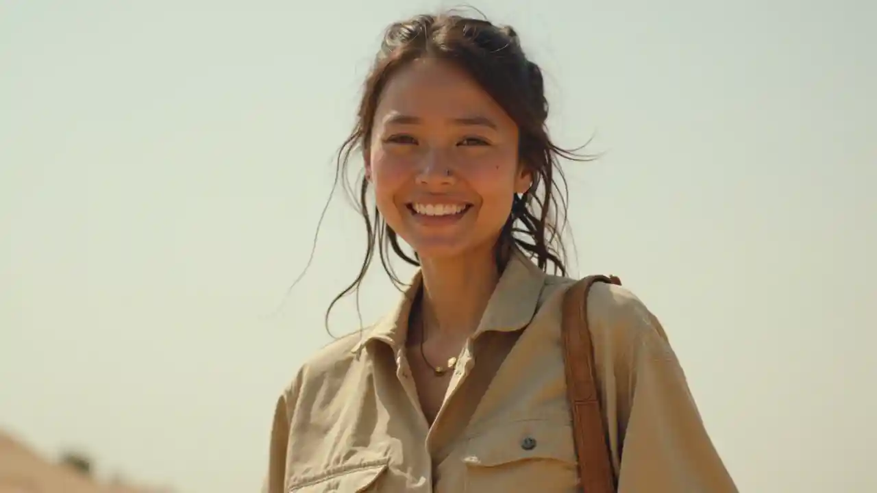 Paisleypersona con actitud amistosa, fondo claro, plano lejano, realista, usa chaqueta de safari, se parece a Kim Chung con bronceado, foto de cuerpo entero