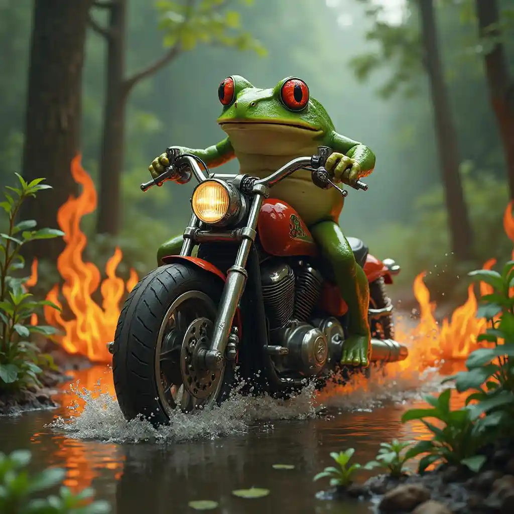 Una rana verde, en moto, alrededor de las llamas, cabalga por un pantano
