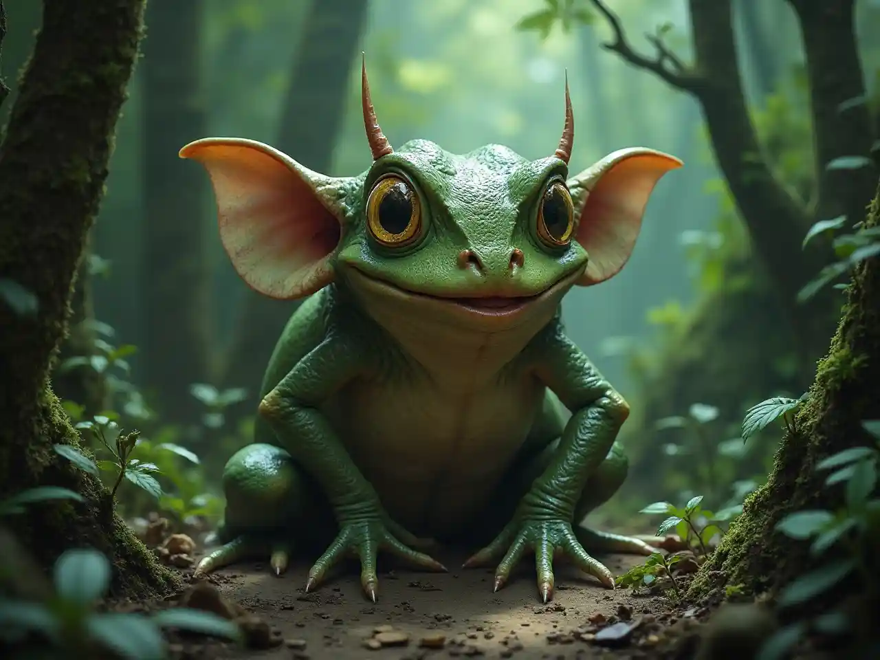 3 pies de ancho y 4 pies de largo. parte rana y parte duende. malévolo vive en lo profundo del bosque. rugoso y un trikster. pequeña daga como los dientes. manos planas. grandes ojos amarillos brillantes. nariz plana. uñas largas. antenas largas que arrastran por el suelo. comer elefantes bebés. grandes y afilados caracoles que son al rojo vivo que corren a lo largo de su espalda.