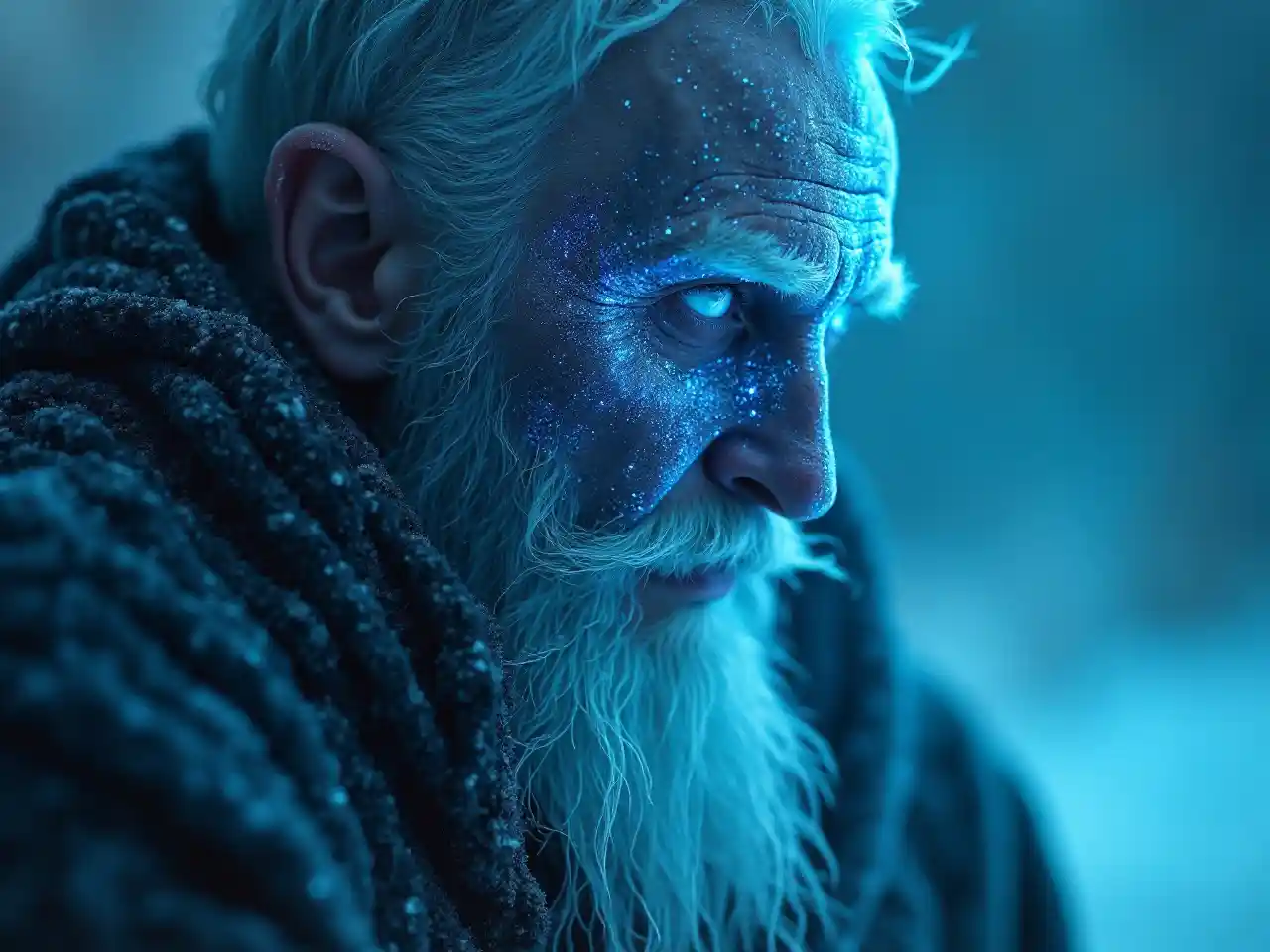 Un retrato simétrico de un nigromante masculino, malvado y congelado, que se disuelve en líneas azules, delgadas y luminiscentes, mágicas y congeladas. El punteado de Voronoi ponderado y la cáustica láser crean una red, pasando de detalles hiperrealistas a formas abstractas de inspiración cuántica. Los tonos etéreos se mezclan, evocando la transición existencial y el misterio. Primer plano en la cara, cráneo malvado parcialmente visible. Con un telón de fondo ártico crepuscular, los vientos helados ondean a través de sus ropas andrajosas. Realizada en una fusión de fotorrealismo y surrealismo digital, la escena está iluminada por las fantasmales auroras boreales. Énfasis en la atmósfera fría y amenazante, invocando mitos nórdicos