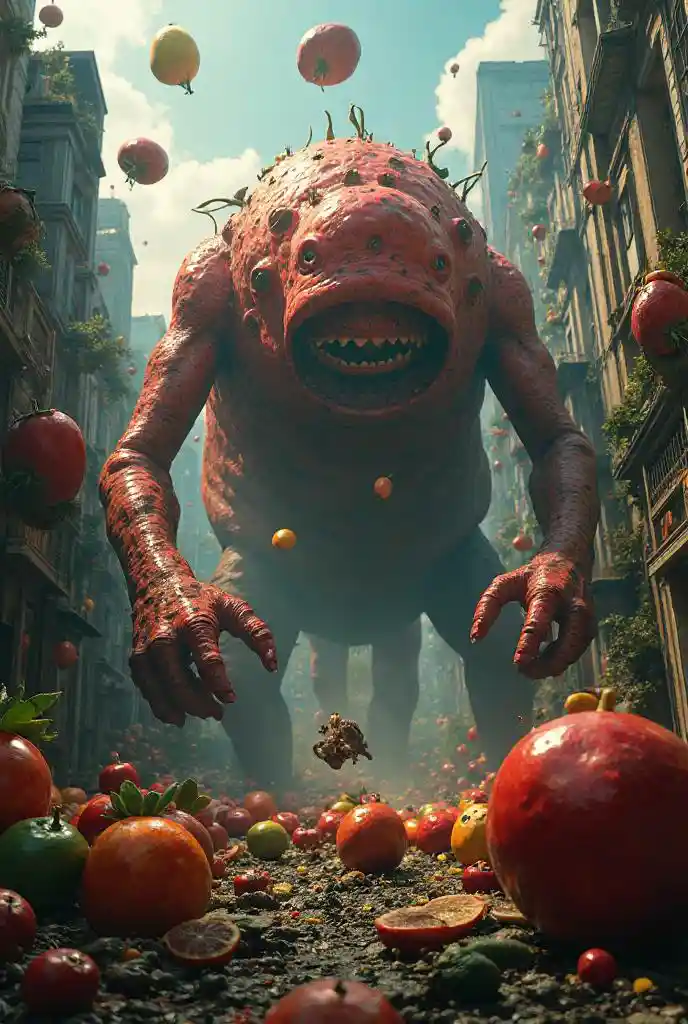 A chaotic apocalyptic scene where giant mutated fruits are destroying a city, surreal and hyper-detailed, dramatic lighting, vibrant colors, cinematic compositi