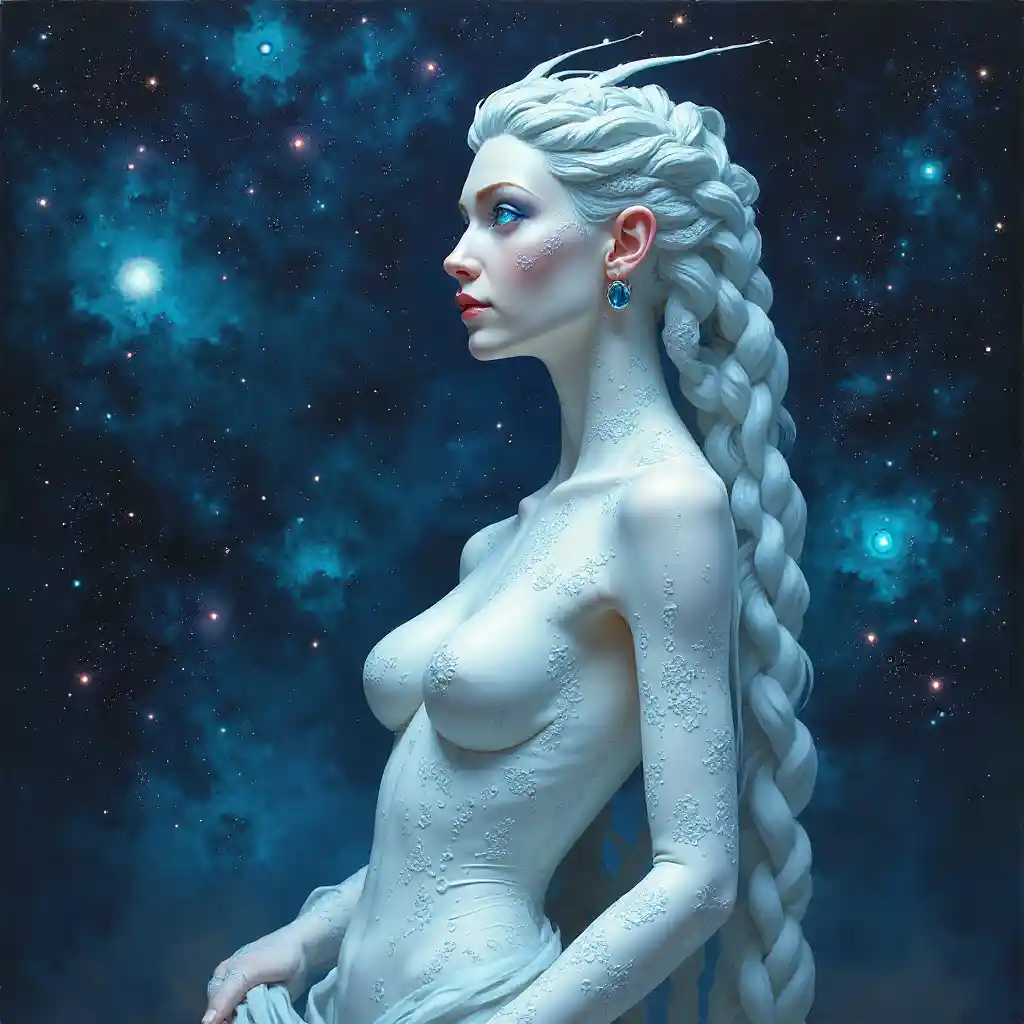 Pintura del Nacimiento de Venus con un androide de piel árabe egipcio translúcido blanco luminoso, adornado con intrincados tatuajes digitales tribales de código QR y elegantes aumentos de ciberware, con el telón de fondo de un profundo mar cósmico de estrellas y nebulosas vibrantes. Estilizado a la manera clásica de Botticelli, este robot humanoide posee cautivadores ojos de cristal azul y cabello elegantemente trenzado.