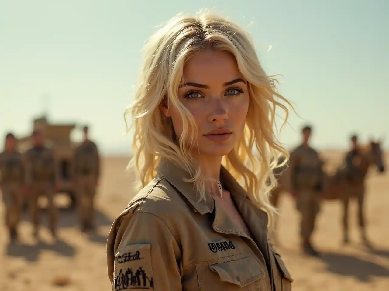 Hermoso cabello rubio de Lady Gaga en una base militar del desierto con un grupo de esposas militares