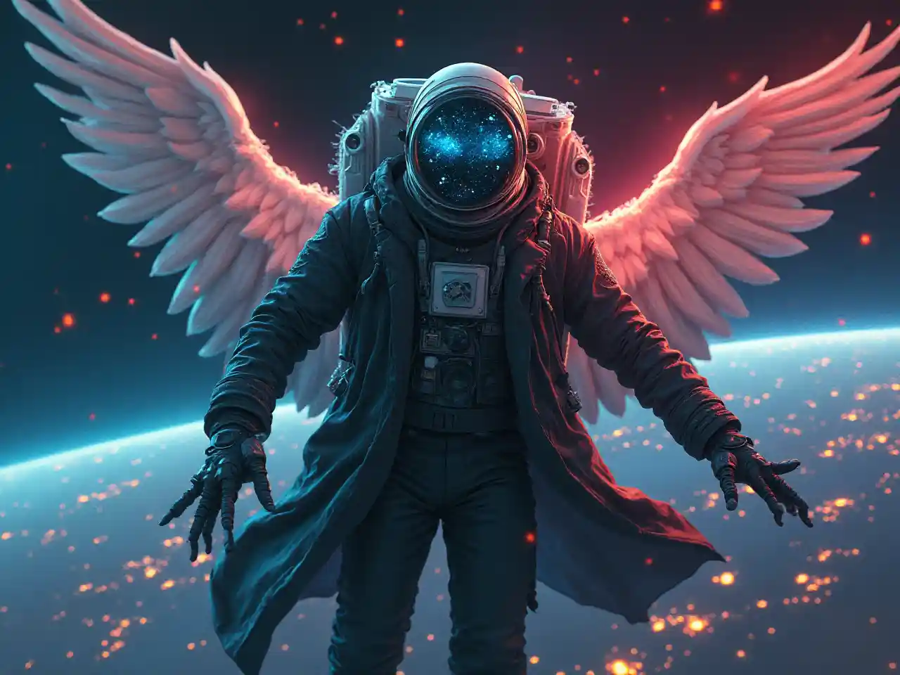 obra maestra, más nuevo, absurdo, seguro, solo, alto detallado, masculino, sin rostro, astronauta, patrón espacial, patrón galáctico en sus lentes, implantes cibernéticos blancos, traje de astronauta de ciencia ficción, astronauta eldritch, fondo espacial, monstruo eldritch, monstruo galáctico, dios galáctico, dios del espacio, alas, arte conceptual, flotante, dios del espacio, pose genial, flotando en el espacio, abrigo largo, abrigo negro, arte conceptual volador, alas grandes, abrigo abierto, colores neón, robot sci fi, robot espacial, androide, mecánico, ciencia ficción, ciberpunk, armadura alargada, boca abajo, alcanzando para tocar al espectador, asomar el visor, jetpack de ciencia ficción, zarcillos mecánicas mecánicas mecánicas mecánicas de ciencia ficción