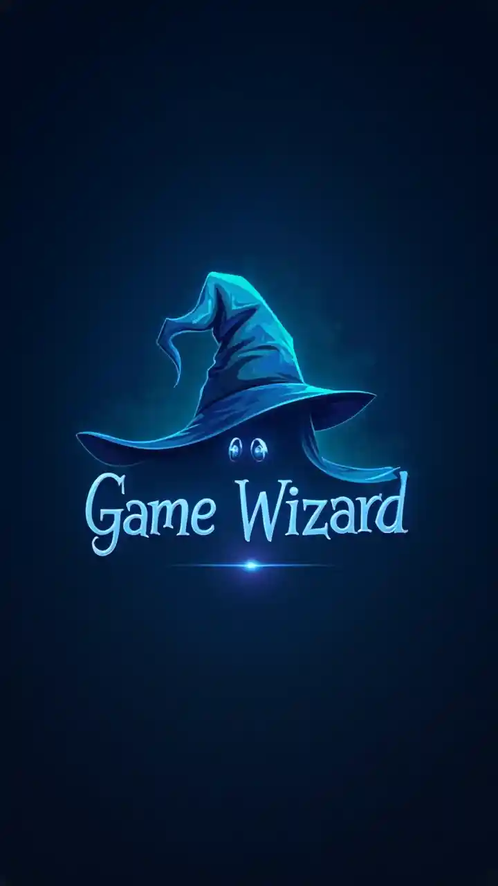 (texto escrito con precisión "Game Wizard "), diseño de logotipo, paleta de colores azules (icónica), con un sombrero de mago estilizado, atmósfera (misteriosa), estética elegante y moderna, líneas limpias, degradados sutiles, representación digital de alta calidad, composiciones dinámicas, adecuado para el entretenimiento, evoca temas de fantasía, diseño cautivador pero simple, perfecto para una audiencia de juegos. Sin humanos, sin personas