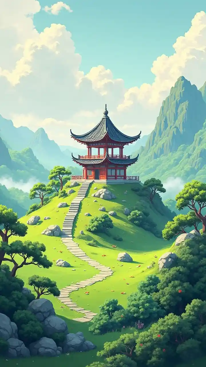 paisaje de un antiguo pabellón chino abierto en un campo de hierba, sin colinas, estilo de fantasía épica, pinceladas vibrantes que recuerdan a las pinturas chinas tradicionales → quitar dragones → poner el pabellón en la cima de una colina suavemente inclinada → hacer que la colina sea más ancha → mover la colina para que ahora esté en un antiguo jardín del palacio japonés, rodeado de exuberantes árboles y flores silvestres, vibras ghibli acogedoras y pacíficas