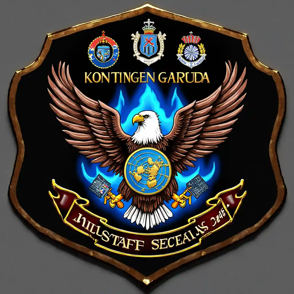 Un emblema de estilo militar en forma de un escudo negro con bordes dorados. En el centro, un águila calva feroz con las alas extendidas, agarrando una insignia circular de la ONU rodeada de múltiples banderas internacionales. Detrás del águila, una dramática llama azul brillante y una onda de cinta roja-blanca en el fondo. En la parte superior, tres insignias militares que representan el ejército, la marina y la fuerza aérea. El texto dorado en negrita en el centro dice 'KONTINGEN GARUDA'. En la parte inferior del escudo, una pancarta dice 'MILSTAFF SECEAST 2024 – 2025'. El diseño es detallado, patriótico y poderoso