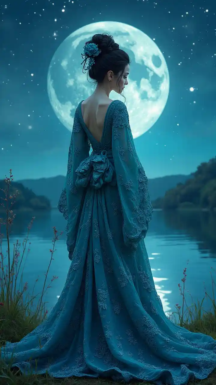 Hermosa Geisha en un azul turquesa y motivos intrincados vestido de encaje mirando el cielo estrellado de la noche de luna llena junto al lago, cabello oscuro, fantasía oscura, detalles intrincados, hiperdetallado, Jean Baptiste Monge, Carne Griffiths, Michael Garmash, seb McKinnon, obra maestra, sol