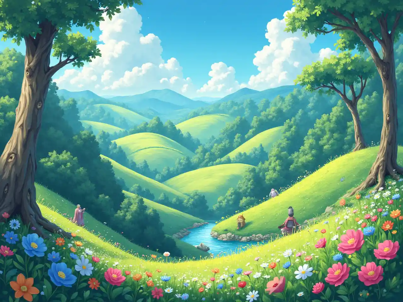 Paisaje de estilo Ghibli, exuberantes colinas, bosques caprichosos, suaves tonos pastel, flores vibrantes, criaturas encantadoras, atmósfera de ensueño, nubes juguetonas, arroyo tranquilo, estética detallada pintada a mano, ambiente conmovedor, luz mágica que se filtra a través de los árboles, armonía encantadora con la naturaleza, telón de fondo sereno, ultra detallado, visualmente cautivador.