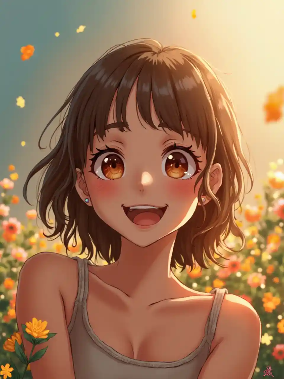 Elijahprimer plano retrato de una linda 1girl, humor divertido, sonrisas, flores alrededor, bengalas