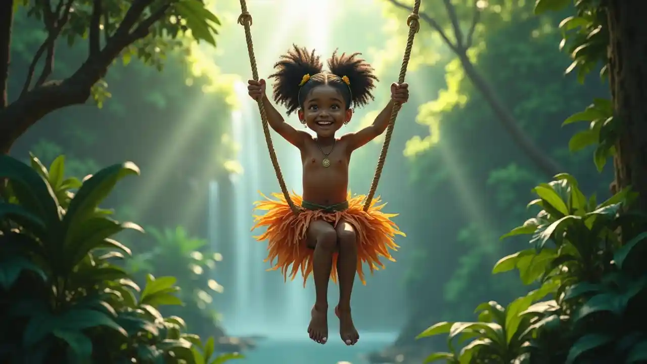 Una niña negra de 8 años con bocanadas se balancea en una cuerda brillante en una jungla, vestida con una falda con acentos de plumas. Pájaros exóticos y cascadas brumosas la enmarcan, su alegre arco irradia energía salvaje y alegría despreocupada en una escena exuberante y fantástica.