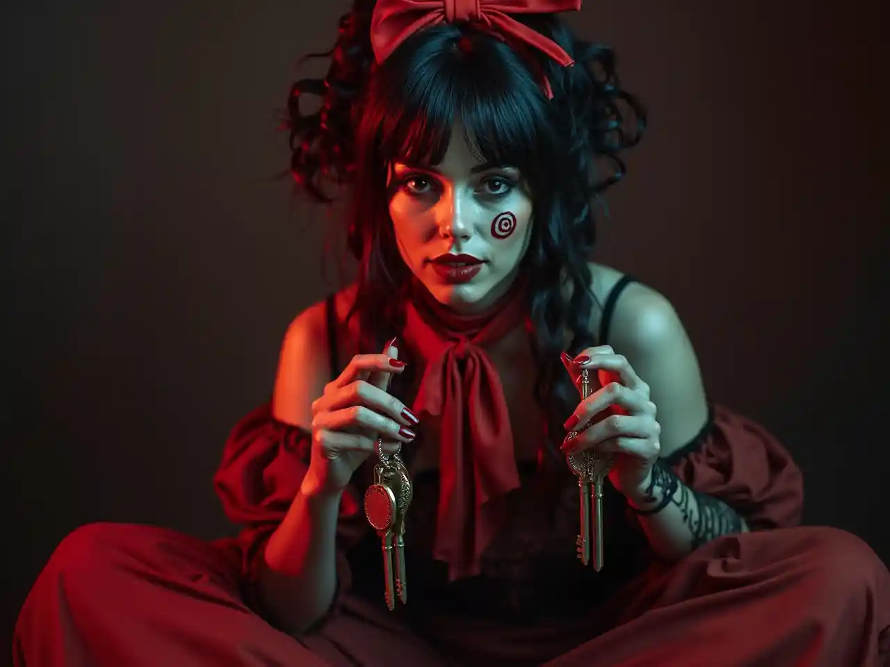 Foto de moda cosplay vanguardista, glamour, maquillaje de mejillas en espiral roja, manicura detallada, llaves en las manos, cabello despeinado con rayas negras, accesorio de pajarita roja, pose con las piernas cruzadas, iluminación cinematográfica ultra glamorosa, editorial de alta costura, rojo-negro
