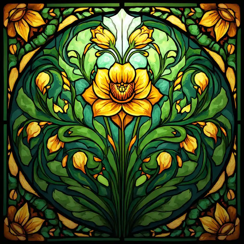 diseño de patrones de vitrales florales, art deco, art nouveau, flores, follaje, detalles increíblemente altos, elegante, dorado, iluminación dramática, colores saturados, verde, orgánico, simétrico, render, alto relieve