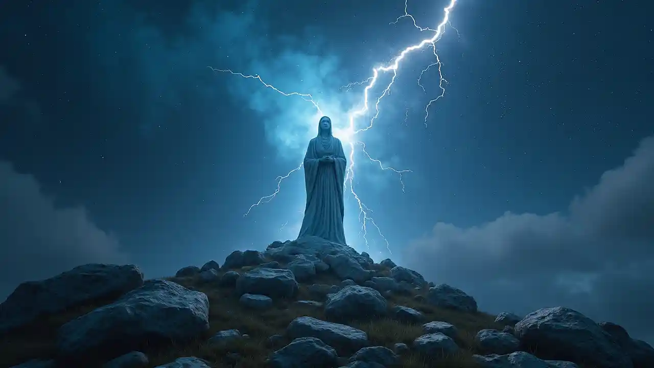 El cielo estrellado se mueve lentamente en diagonal hacia abajo, mientras el perno de electricidad se esfuma desde la piedra de pie que se transforma en una diosa y de vuelta en una piedra de pie, se enciende en las manos de la persona que se ilumina momentáneamente antes de oscurecerse de nuevo.