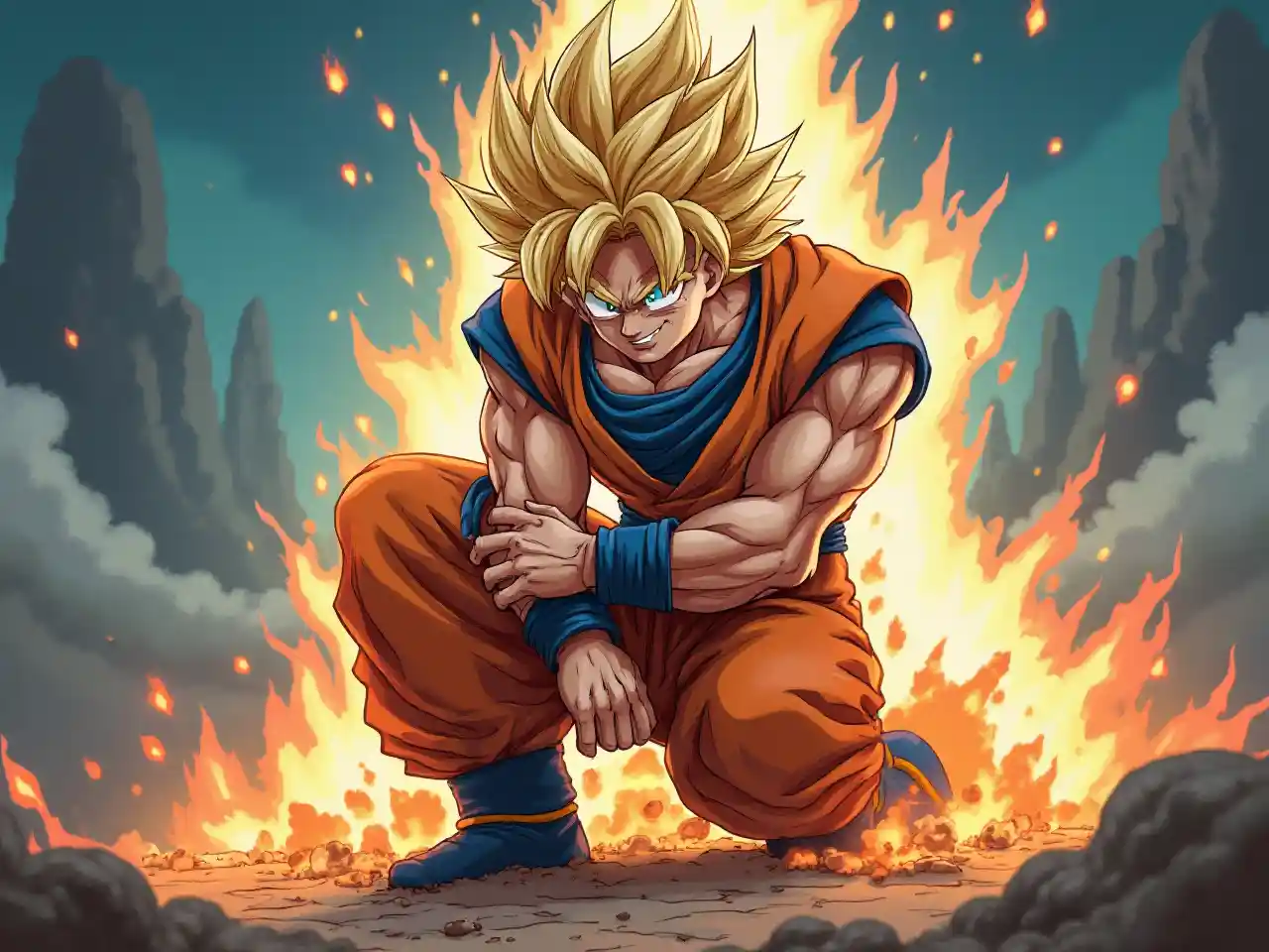 EleanorGoku de Dragonball z se vuelve súper sayain y frente a él está la palabra "ThyJay" por sus rodillas