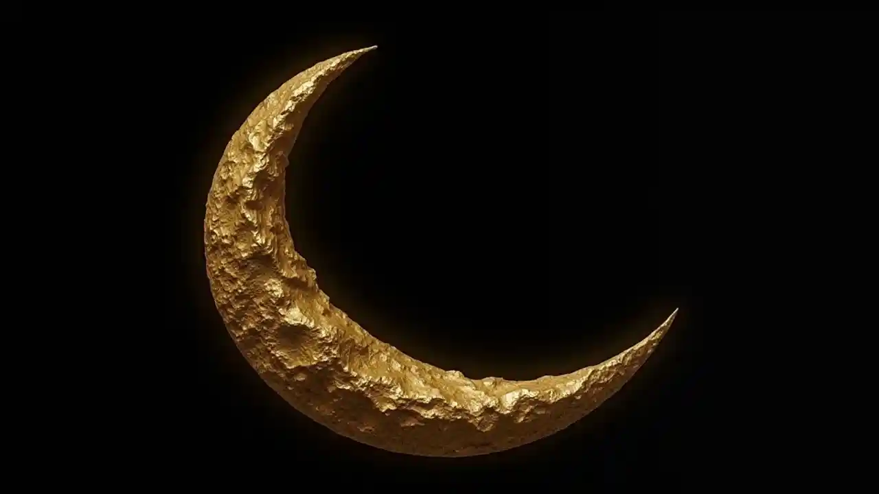 Esta imagen muestra una media luna creciente con una apariencia dorada texturizada, sobre un fondo negro. La superficie de la luna tiene un acabado metálico y granulado, lo que le da un aspecto lujoso y elegante.