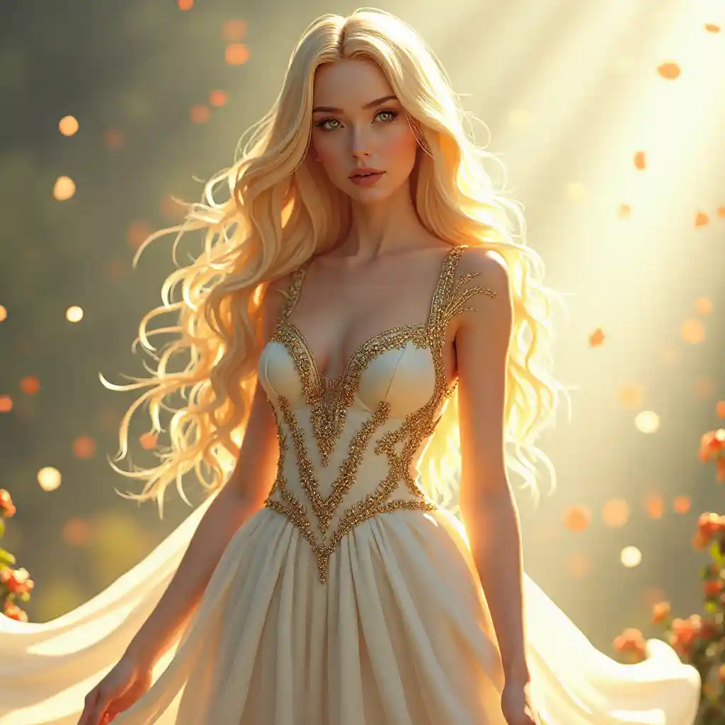 Una princesa humanoide regia con cabello dorado suelto se encuentra equilibrada, su mirada se encuentra con el espectador. Está adornada con un espléndido vestido blanco, ricamente adornado con detalles dorados, lo que refleja un sentido de elegancia y detalles intrincados que recuerdan a una pintura digital. La obra de arte es altamente refinada, inspirándose en los estilos del arte conceptual de Artstation y el genio de artistas como Artgerm, Greg Rutkowski y Alphonse Mucha. Ambientada en un día brillantemente soleado, la escena captura la impresionante luz del sol con delicada floración y radiantes rayos de luz, realzados por un sutil efecto bokeh pentagonal. La ilustración emana un sentido de gracia y belleza sin elementos no deseados, manteniendo la claridad y las proporciones perfectas, libres de distorsiones o imperfecciones.