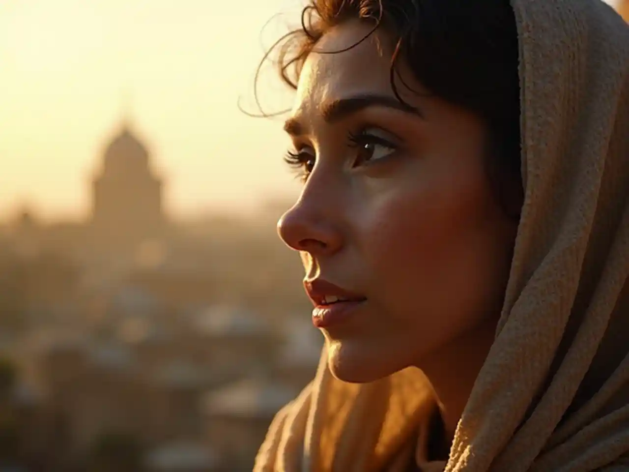 un primer plano cautivador de una mujer, su mirada dirigida fuera de cámara hacia la derecha. Una luz suave y dorada baña la escena, sugiriendo el amanecer o el atardecer, y arroja suaves reflejos sobre sus facciones y la tela que cubre su cabeza. El estilo de la cubierta de la cabeza insinúa un significado cultural o religioso. En el fondo borroso, un paisaje urbano se despliega bajo la luz cálida, con lo que parece ser una estructura abovedada prominente, posiblemente una mezquita o un hito arquitectónico similar, lo que sugiere aún más un entorno de Oriente Medio o el sur de Asia. El estado de ánimo general es sereno y contemplativo, invitando a la especulación sobre la historia de la mujer y su conexión con la ciudad distante.