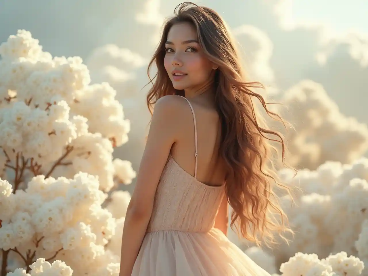 A ((((mujer hermosa))) at (((vista de cuerpo completo))), con (cabello castaño ondulado intrincado y altamente detallado) que fluye suavemente en el (viento suave), complementado por ((piel natural y brillante)) y (ojos brillantes como diamantes) que exudan una esencia etérea. Está vestida con un (vestido radiante de inspiración pastel) que la acentúa perfectamente (figura perfecta), con delicadas flores que iluminan suavemente sus facciones. La escena es (suavemente retroiluminada) con una (luz de relleno frontal) que se enfoca en su rostro, destacando su (tez natural e impecable) y (detalles intrincados) que emiten un (brillo hiperrealista y ultra detallado) rodeado de un blanco onírico. Flores y nubes vívidas.